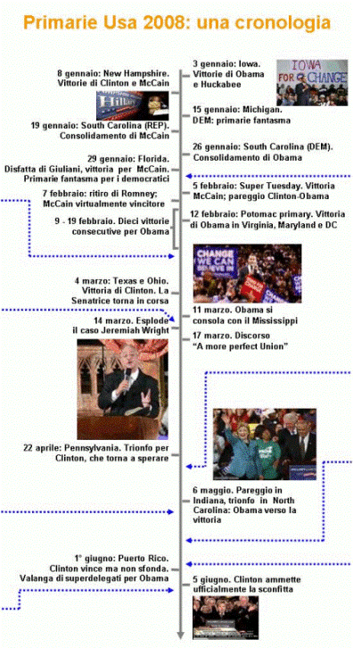 La lunghissima campagna delle primarie Usa 2008 si è aperta il 3 gennaio, con la consultazione in Iowa, e si è conclusa esattamente cinque mesi dopo, il 3 giugno, con le battaglie in Montana, New Mexico e South Dakota.